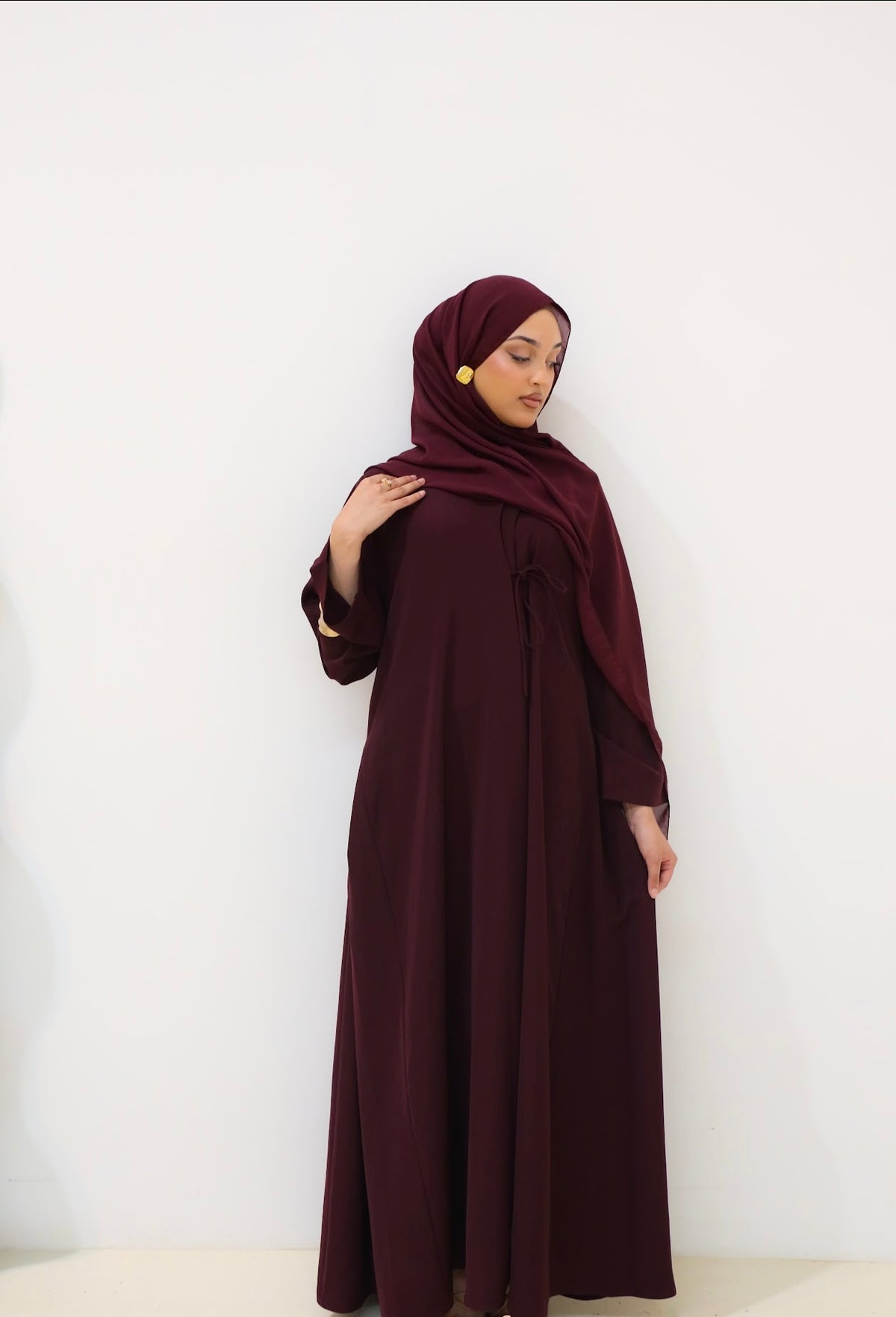 Available in two captivating shades - rich plum, a deep luxurious burgundy and sand, a soft, light beige that embodies understated elegance. The Amara Abaya offers Versatility for any occasion. The delicate waist tie detail adds a customisable, flattering fit, blending modesty and contemporary style effortlessly.